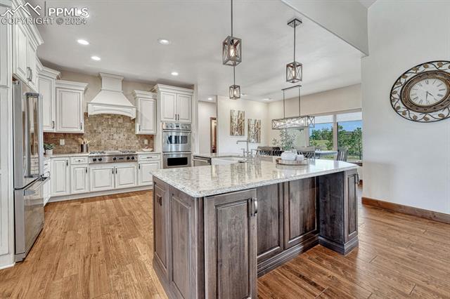 This stunning ranch-style home, built in 2017 on a 2.5-acre corner premier lot was designed to be a haven of luxury, with high-end finishes and added features, including a gourmet kitchen with custom Brooks Brothers cabinets, Viking appliances, exquisite wide plank wood flooring, vaulted ceilings with plantation shutters, tinted windows throughout and a striking stone fireplace.