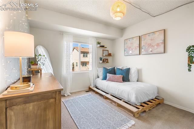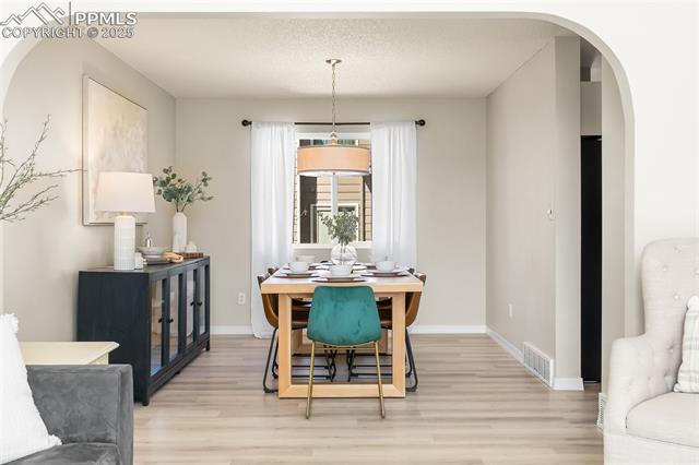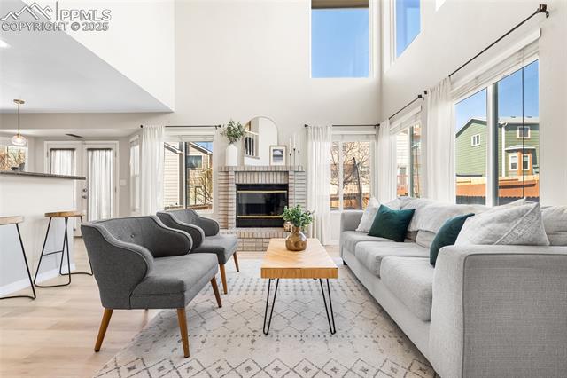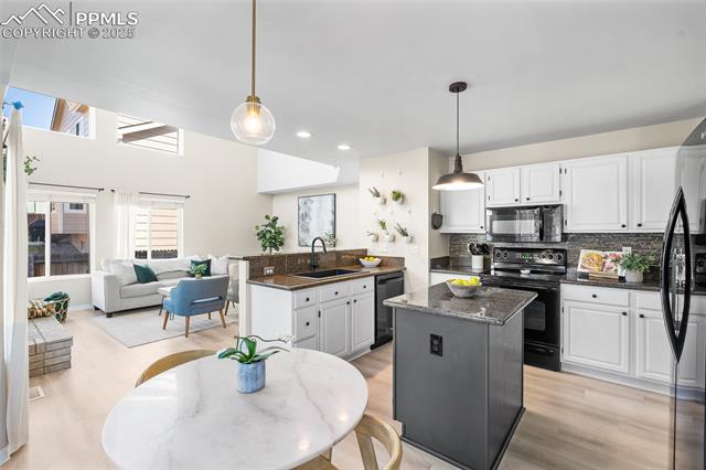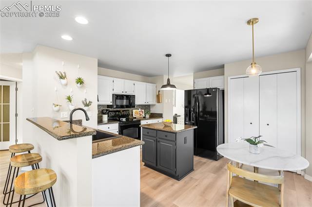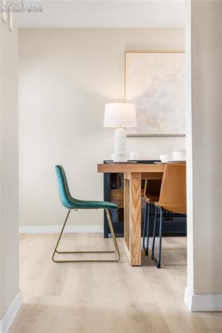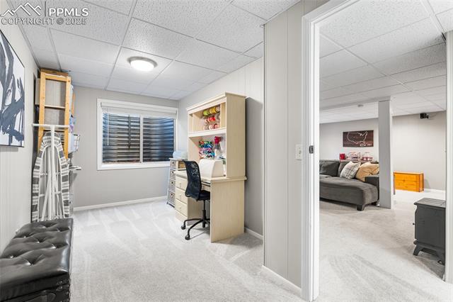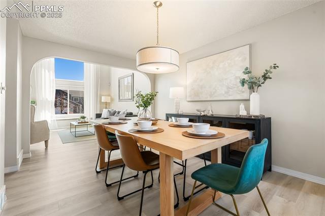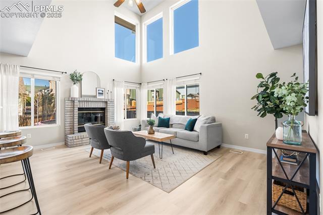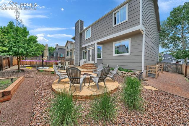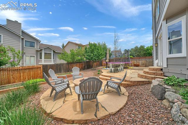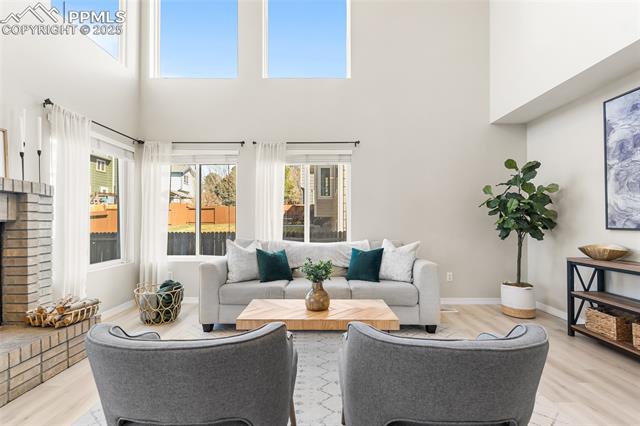 Welcome to this stunning 5-bedroom, 4-bath home with a main-level office, nestled in the highly sought-after Pinewoods neighborhood & the award-winning D20 school district. From the moment you arrive, you'll appreciate the charm, elegance, and thoughtful updates throughout, including beautifully updated flooring on the main level, upgraded interior and exterior paint, modern lighting, and improvements that enhance both style and function. The kitchen features granite countertops, an island, all appliances, a pantry, and abundant cabinetry. Formal living & dining rooms offer elegant spaces to host, while the inviting family room impresses with soaring vaulted ceilings, expansive windows that flood the space with natural light, and a beautiful fireplace equipped for a gas insert. The main-level office is perfect for working from home or can easily serve as a sixth bedroom for added flexibility. Upstairs, the spacious primary suite boasts lovely Pikes Peak views, a walk-in closet, and a luxurious ensuite bath, complemented by two additional bedrooms and an updated full bath. The fully finished basement offers a private and versatile retreat--ideal for multi-generational living or guests--with a second family room, two additional bedrooms, a 3/4 bath, and generous laundry & storage space. Step outside to enjoy the best of Colorado living in a fully fenced, professionally xeriscaped backyard featuring a stunning tiered patio, built-in gas fireplace, and raised garden beds--perfect for outdoor entertaining or peaceful relaxation. Additional highlights include central A/C, a two-car garage with built-in storage, 50-yr composite roof shingles, fiber optic internet/cable and no HOA. Tucked away in a quiet, established neighborhood within walking distance to schools and just minutes from Pine Creek Golf Course, the Shops at Briargate, Interquest dining and entertainment, and the Air Force Academy--with easy access to I-25--beautifully maintained & move-in-ready!