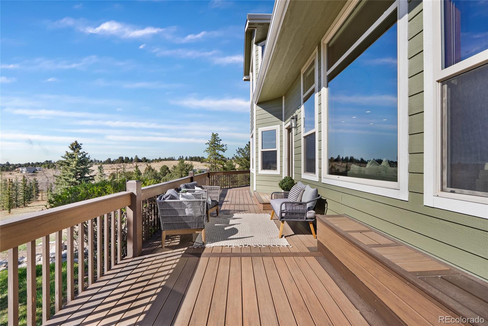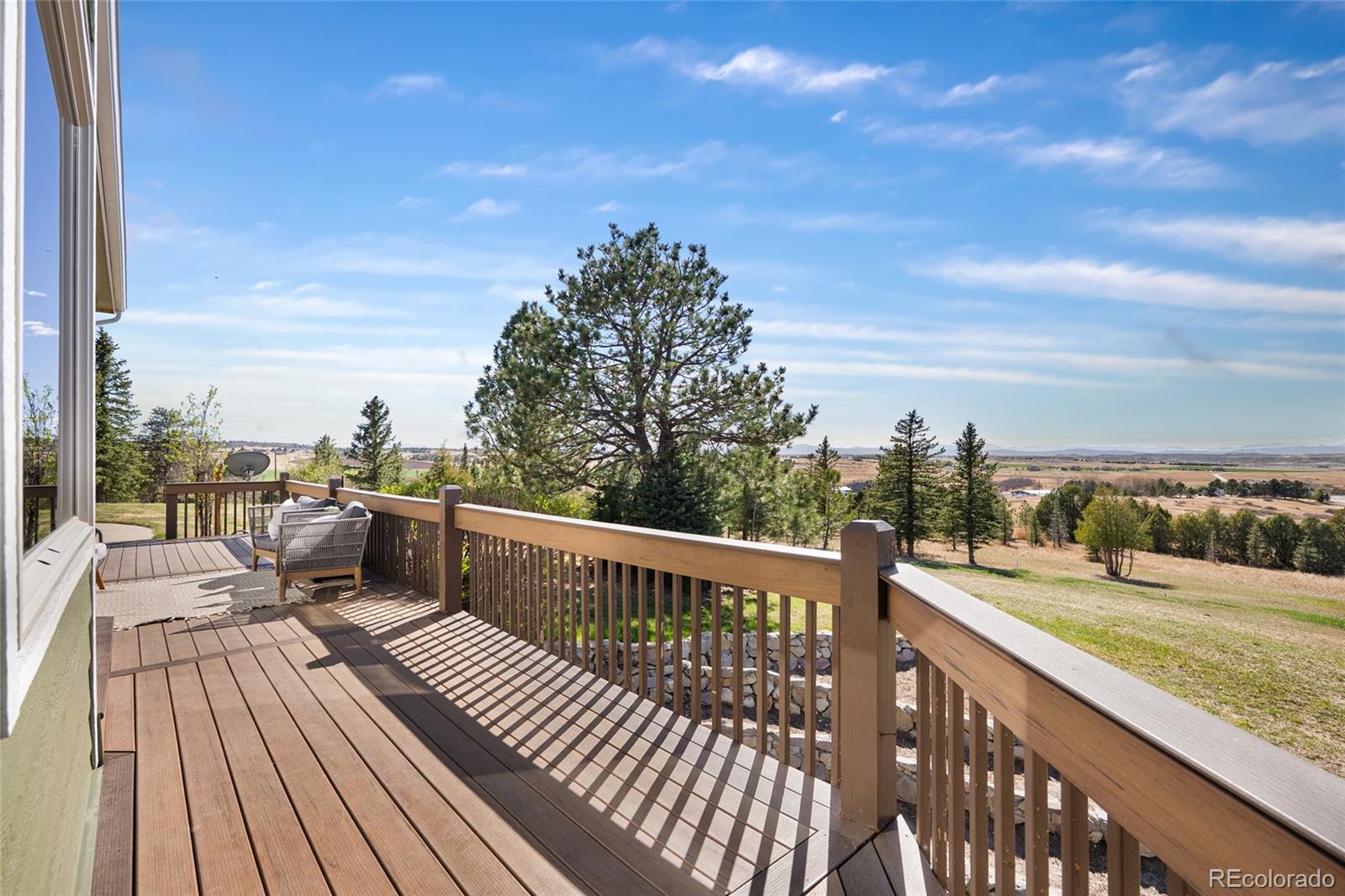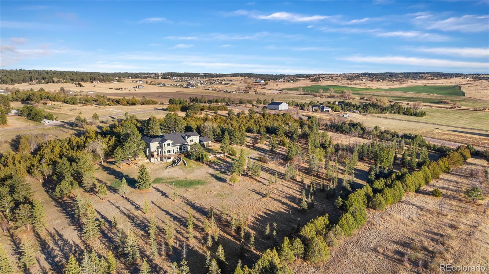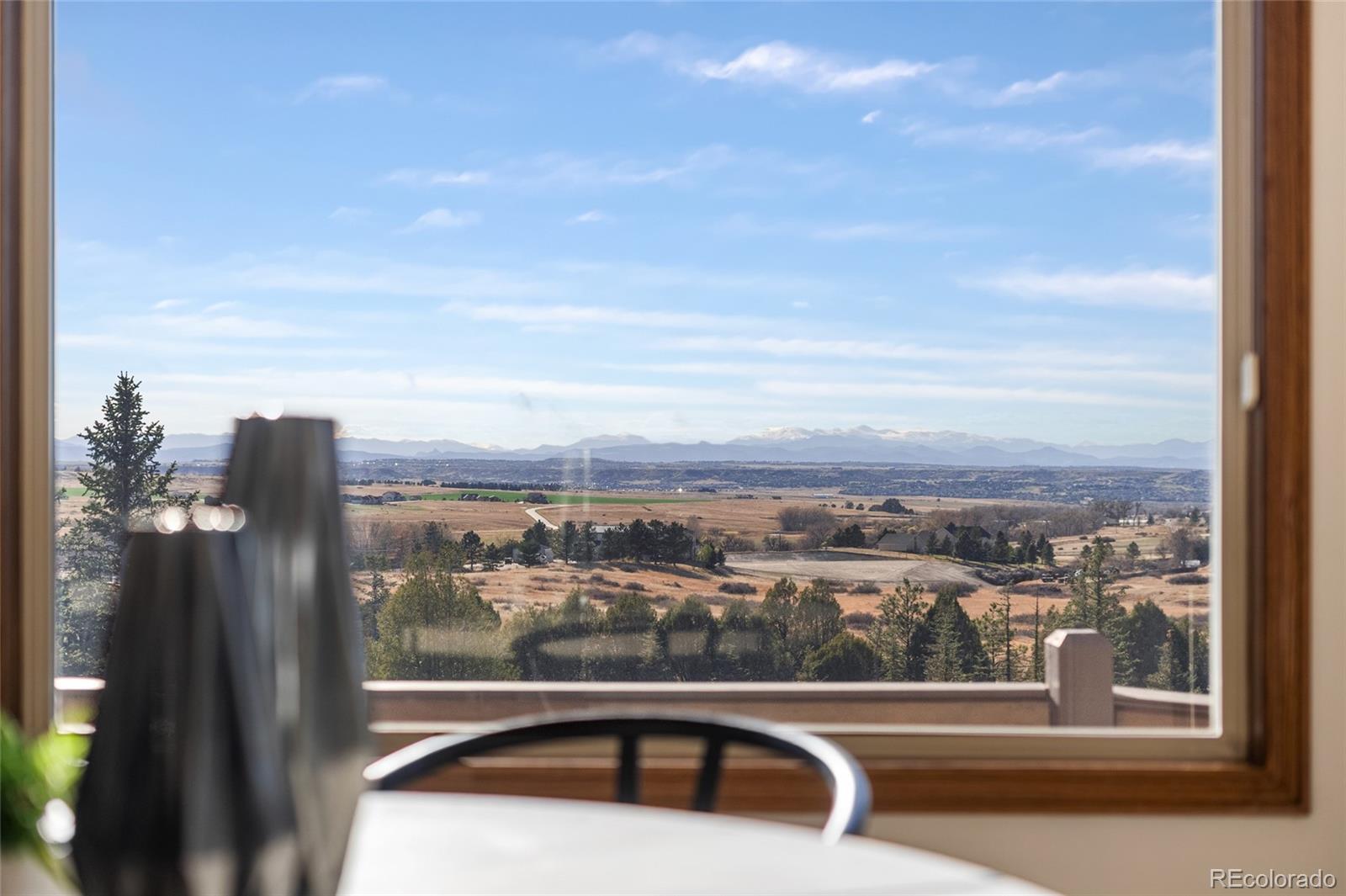 Nestled on 13.91 acres in the coveted Sterling Tree Farm community of Parker, this extraordinary custom estate offers a rare blend of privacy, space, and truly breathtaking Rocky Mountain views--stretching from Pikes Peak to Longs Peak. Set on one of the largest lots in the neighborhood and backing to open space, the property provides a serene, secluded setting with room to roam and enjoy Colorado living at its finest. This home features 5 bedrooms and 5 bathrooms, including two primary suites--one on the main level and one upstairs--each with en suite baths and walk-in closets. The thoughtfully designed floor plan also includes a main-floor office and a private fifth bedroom above the garage with its own entrance - ideal for guests, multigenerational living, or in-law quarters. The recently remodeled kitchen is a true showstopper, showcasing brand-new custom cabinetry, top-of-the-line Sub-Zero and Wolf appliances, an induction cooktop, double ovens, a wet bar. Car enthusiasts and hobbyists will appreciate the oversized 4-car attached garage as well as the impressive 2,200-square-foot outbuilding, offering space for up to 10 additional vehicles including an RV garage door, a half bath, and endless possibilities for storage, toys or workshop. Zoned for two horses and includes water rights! Additional highlights include a walk-out unfinished basement ready for customization, a brand-new hail-resistant roof, new luxury plank flooring, new carpet, fresh interior paint, remodeled bath, a new asphalt driveway, updated water filtration system, all-new siding, rebuilt boiler system, and a newly replaced sewer line. Enjoy low HOA dues and easy access to nearby riding and hiking trails, while remaining conveniently close to the Colorado Horse Park, Centennial Airport, DIA, I-25, and an array of dining and shopping options. With stunning mountain views from nearly every window, this is a truly special opportunity to own a one-of-a-kind Colorado retreat.