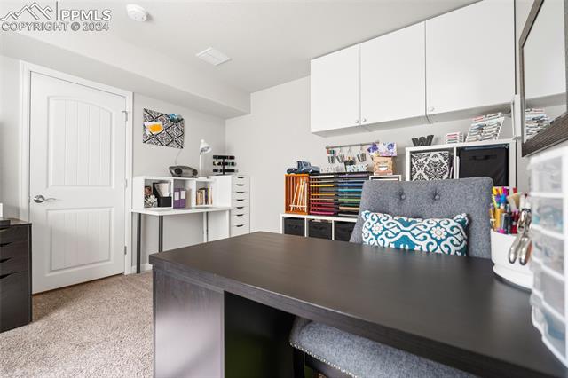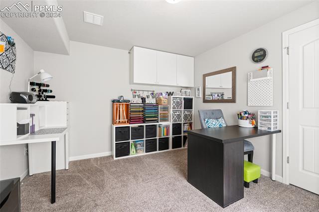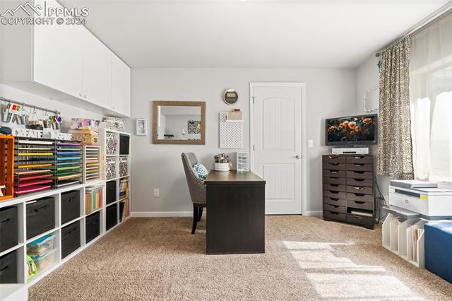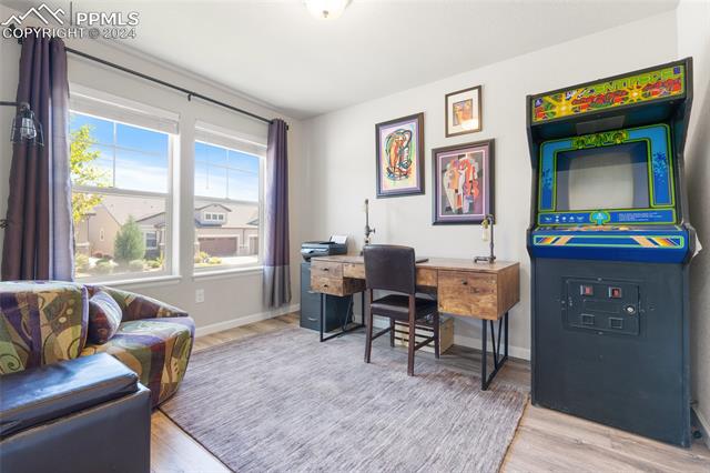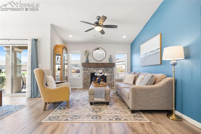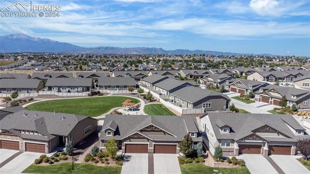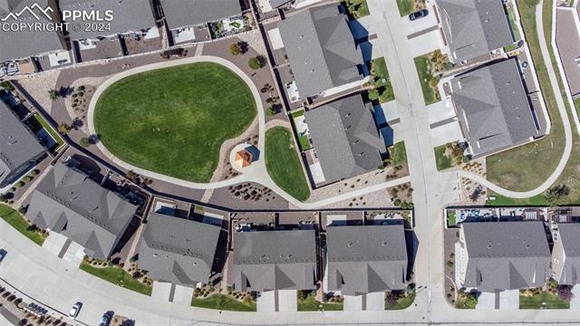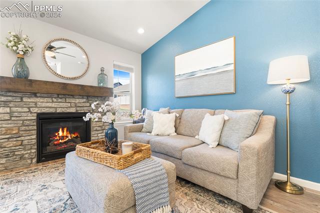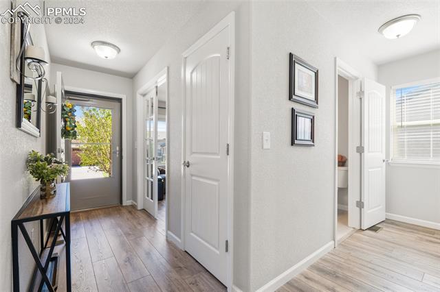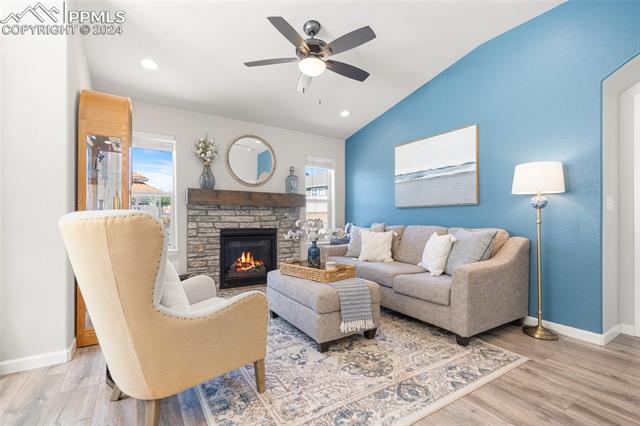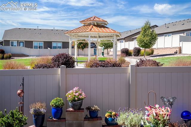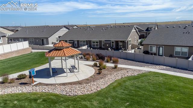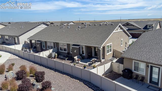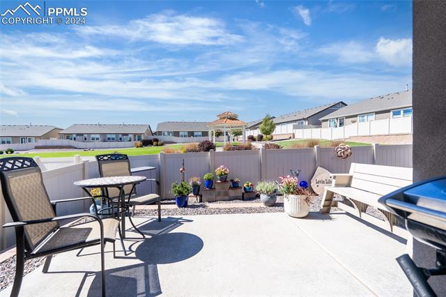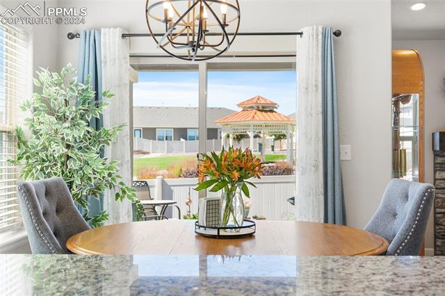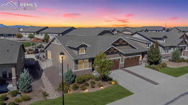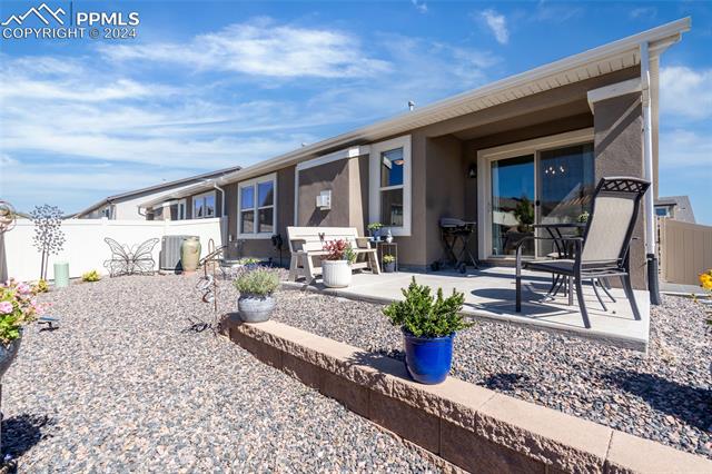 Discover the perfect blend of style, comfort, and low-maintenance living in this stunning 3-bedroom, 3-bathroom home with a dedicated office and a 2-car garage. Situated on a premium lot backing onto a serene green space with walking paths and a charming gazebo, this home offers a peaceful retreat to enjoy the beauty of Colorado. The elegant stucco and stone exterior lends timeless curb appeal, while the thoughtfully designed interior showcases luxury LPV wood floors throughout the entire main level, updated light fixtures, an abundance of natural light, and numerous high-end upgrades. The chef's kitchen is a culinary delight, boasting granite countertops, a striking backsplash, a large island, stainless steel appliances, a gas range, a pantry, and plenty of cabinet space. The adjacent dining area opens to a beautifully landscaped, fenced backyard oasis with a covered patio--perfect for outdoor gatherings. The inviting living room centers around a cozy stone gas fireplace with a wood mantle, creating a warm, welcoming ambiance. The primary suite is a luxurious sanctuary with a spacious walk-in closet and a spa-like en-suite bathroom, complete with dual vanities, granite countertops, and a walk-in shower. Also on the main level is a versatile office with French doors, an updated laundry room with a newer washer and dryer, and a stylish powder bath. The fully finished basement expands your living space with a family room featuring a built-in wet bar and beverage fridge, two additional bedrooms with walk-in closets, a full bathroom, and ample storage. Move-in ready, this home includes air conditioning and a new roof October 2024. With guest parking nearby, hosting friends and family is effortless. You'll also enjoy convenient access to military bases, schools, parks, shopping, entertainment, and power corridors. Don't miss your chance to embrace a low-maintenance lifestyle in this beautiful, move-in-ready home!