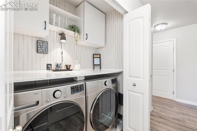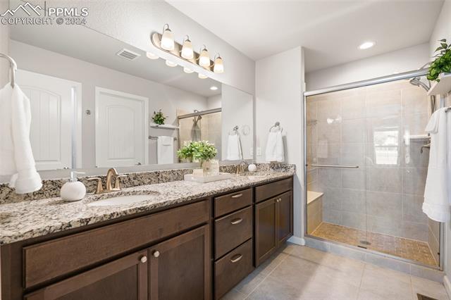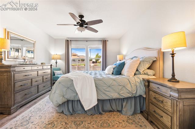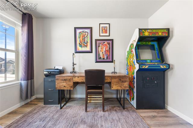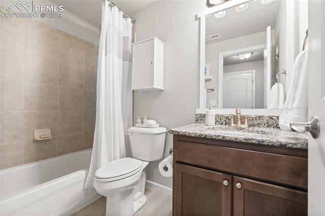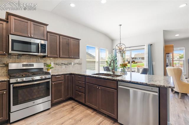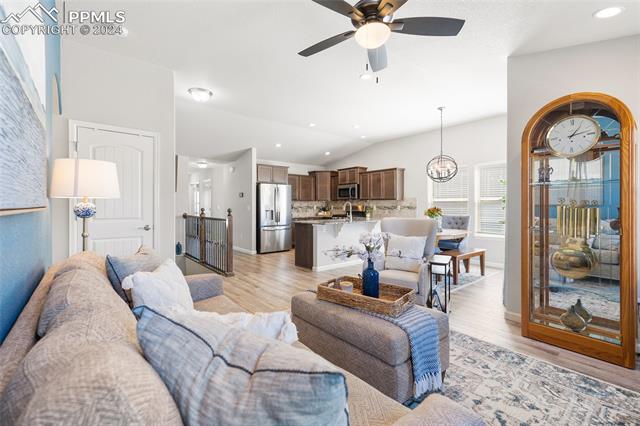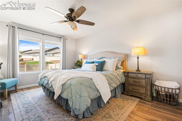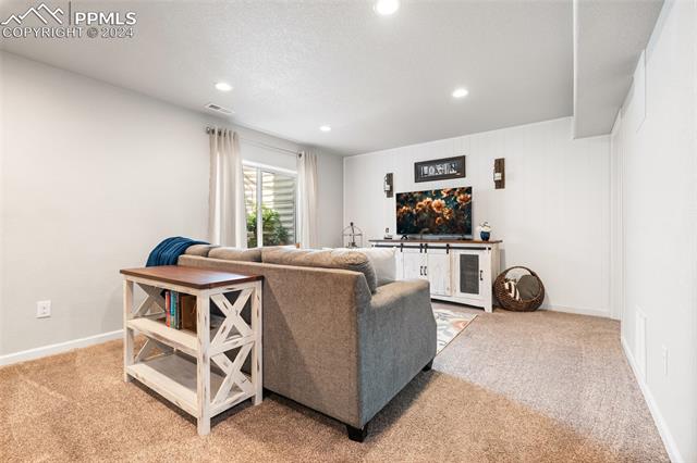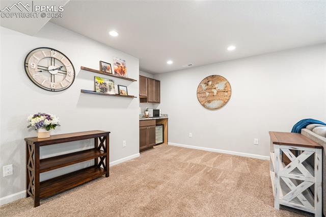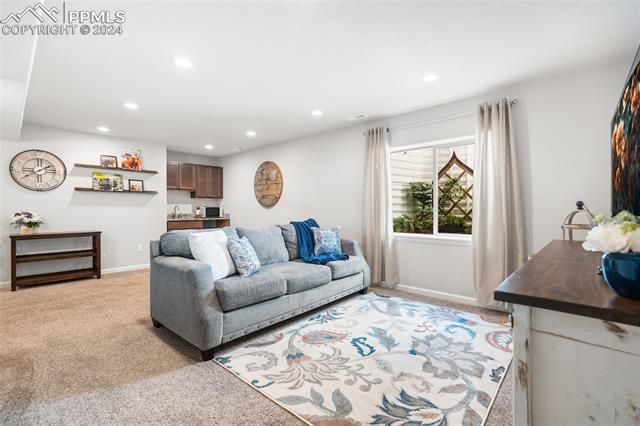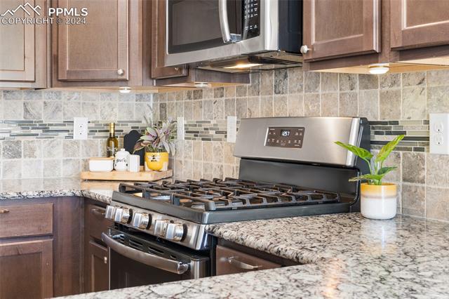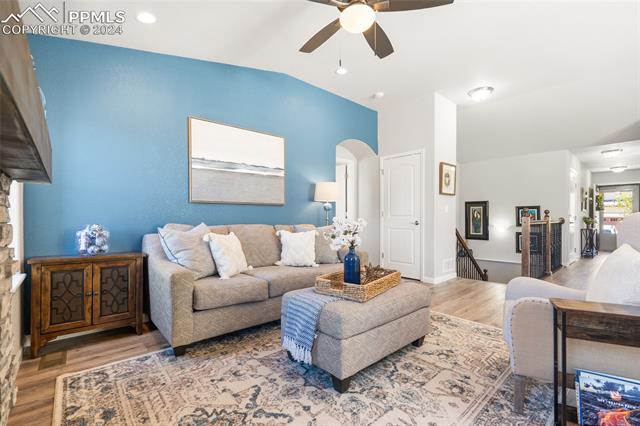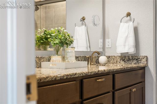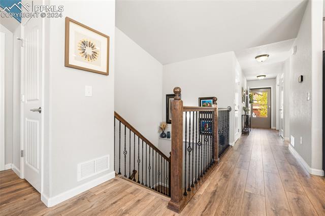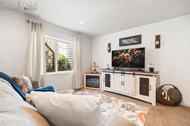 Discover the perfect blend of style, comfort, and low-maintenance living in this stunning 3-bedroom, 3-bathroom home with a dedicated office and a 2-car garage. Situated on a premium lot backing onto a serene green space with walking paths and a charming gazebo, this home offers a peaceful retreat to enjoy the beauty of Colorado. The elegant stucco and stone exterior lends timeless curb appeal, while the thoughtfully designed interior showcases luxury LPV wood floors throughout the entire main level, updated light fixtures, an abundance of natural light, and numerous high-end upgrades. The chef's kitchen is a culinary delight, boasting granite countertops, a striking backsplash, a large island, stainless steel appliances, a gas range, a pantry, and plenty of cabinet space. The adjacent dining area opens to a beautifully landscaped, fenced backyard oasis with a covered patio--perfect for outdoor gatherings. The inviting living room centers around a cozy stone gas fireplace with a wood mantle, creating a warm, welcoming ambiance. The primary suite is a luxurious sanctuary with a spacious walk-in closet and a spa-like en-suite bathroom, complete with dual vanities, granite countertops, and a walk-in shower. Also on the main level is a versatile office with French doors, an updated laundry room with a newer washer and dryer, and a stylish powder bath. The fully finished basement expands your living space with a family room featuring a built-in wet bar and beverage fridge, two additional bedrooms with walk-in closets, a full bathroom, and ample storage. Move-in ready, this home includes air conditioning and a new roof October 2024. With guest parking nearby, hosting friends and family is effortless. You'll also enjoy convenient access to military bases, schools, parks, shopping, entertainment, and power corridors. Don't miss your chance to embrace a low-maintenance lifestyle in this beautiful, move-in-ready home!