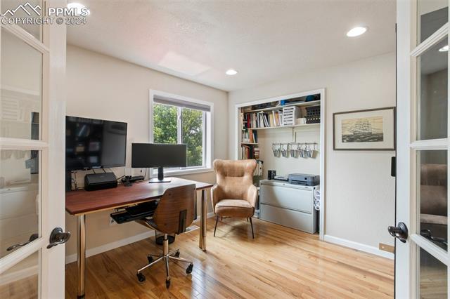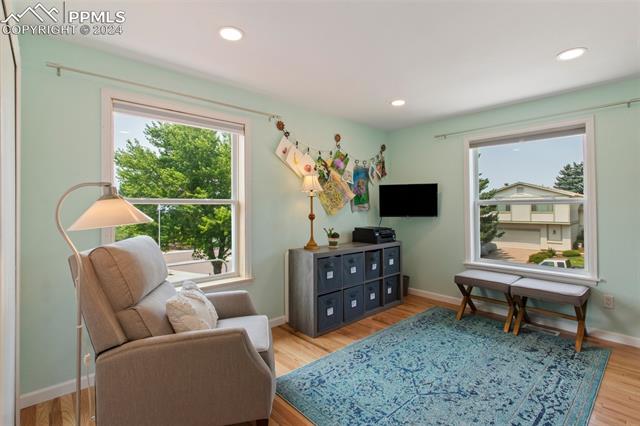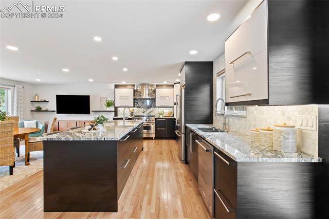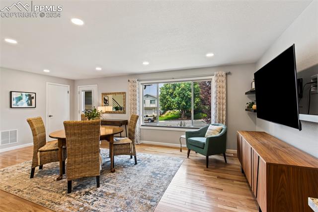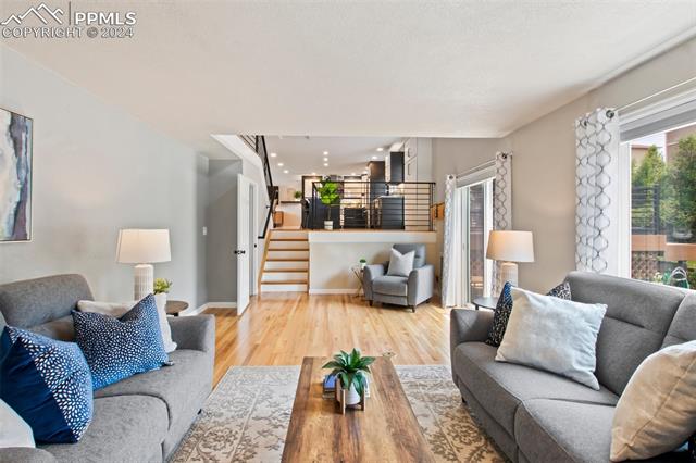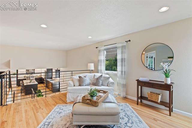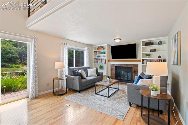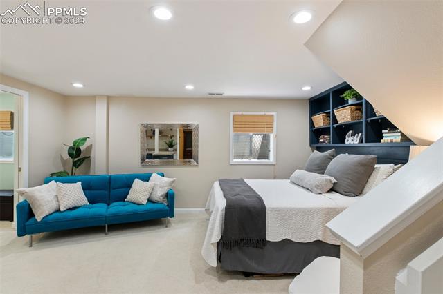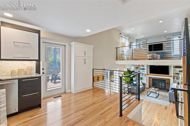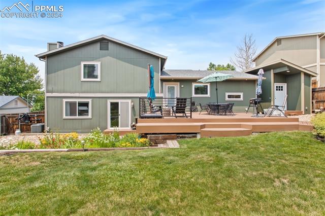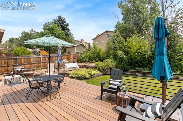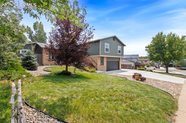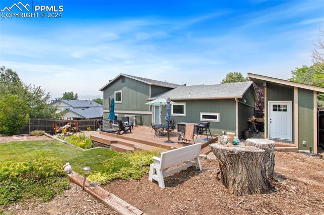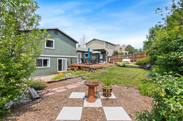 Welcome to this remarkable, updated Briargate home in D20 where function meets modern style and elegance. As you enter, you'll notice the completely remodeled custom kitchen boasting a 9 foot island with prep sink, sleek custom cabinets, granite countertop and backsplash, under and above-cabinet lighting, 48 inch gas range, and stainless steel appliances. With high attention to detail given to this home, you'll notice the beautiful hardwood floors and custom metal railing that exude warmth and sophistication. The living room, bright with abundant natural light, features a fireplace, built-in shelving and walkout to a patio garden area. The upper level features a cozy loft overlooking the kitchen and living room and offers magnificent views of Pikes Peak. You will also find an office with French doors that could be a bedroom, a sizeable primary suite with upgraded bathroom featuring a double vanity, walk-in shower and custom tile work, and an additional bedroom and full bathroom. The basement is a versatile retreat, featuring a separate suite with a wet bar and compact fridge, a sitting room/exercise room, large storage closet and a 3/4 bathroom, providing an ideal space for guests, a home gym, or a private relaxation area. Outside prepare to be delighted at the expansive composite deck with custom railing, fenced in yard, garden area and mature trees. Equipped with many new amenities, including a newer A/C and furnace, newer windows, an upgraded electrical panel, a new roof in 2024, and a new shed built in 2023 with incredible storage that beautifully complements the home's architecture. Additionally, the driveway features newer concrete and the garage is insulated, drywalled, and wired for a workshop with a 220 connection and a new garage door. There is an RV pad directly next to the home with a 50 amp connection. Plus, no HOA and the location provides easy commute to I-25 or Powers, and is close to schools, parks, military bases, shopping and entertainment.