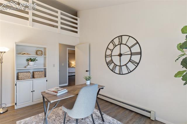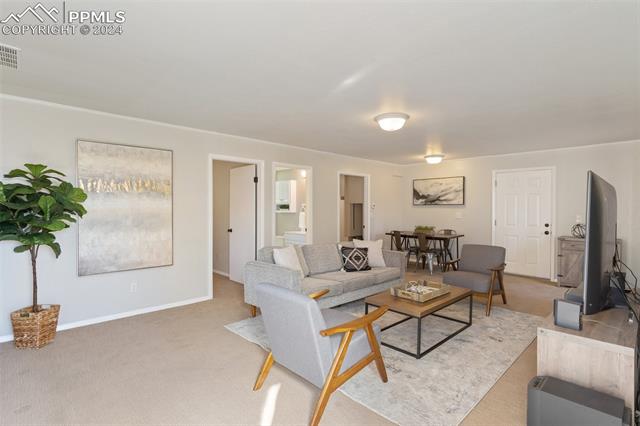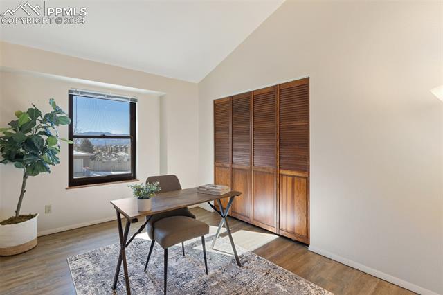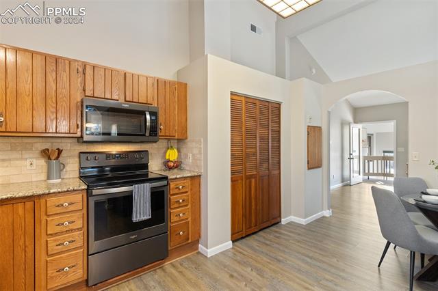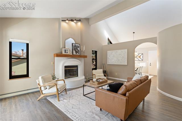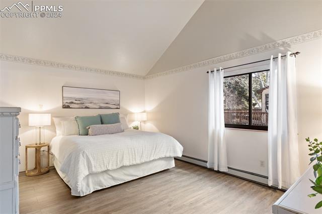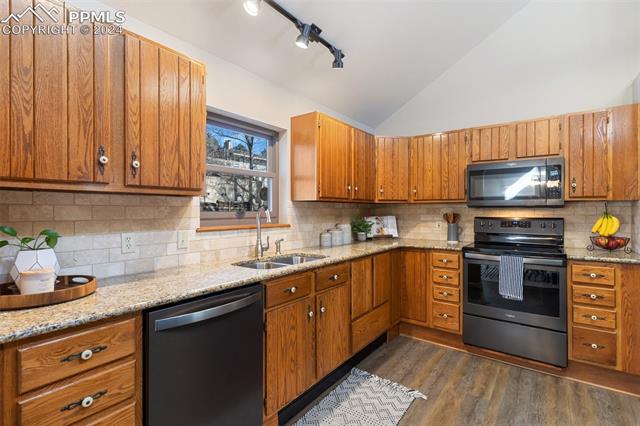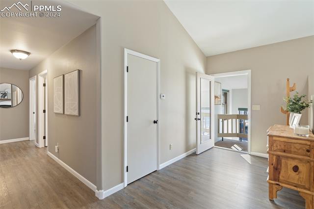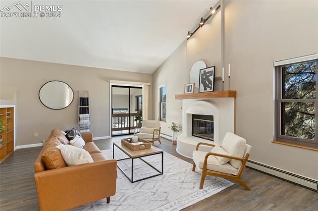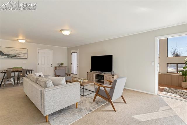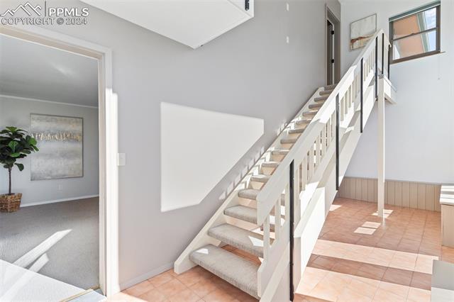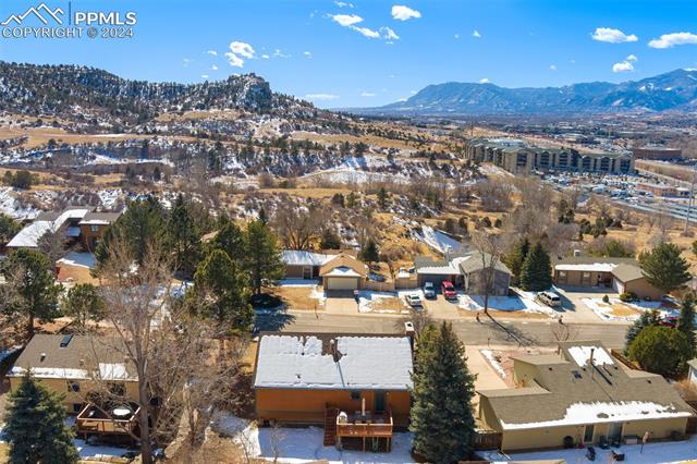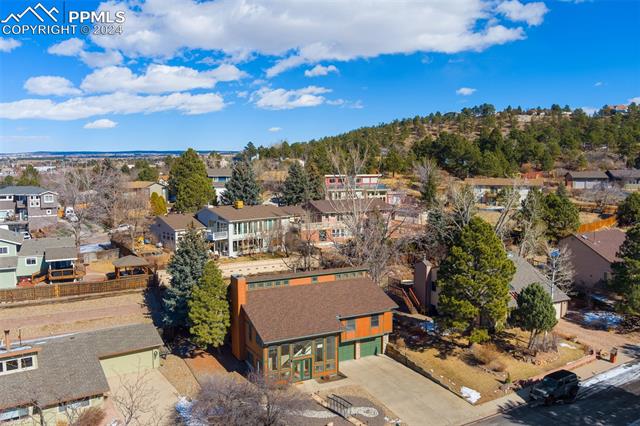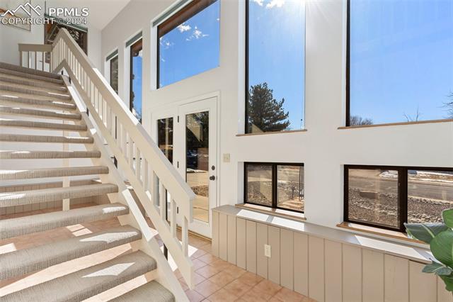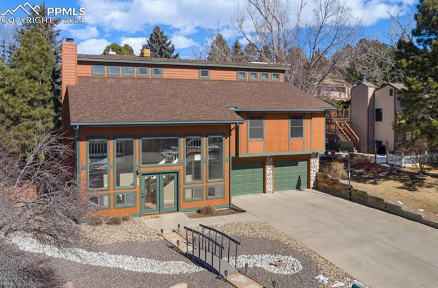 Experience the charm of this beautiful 4-bed, 3-bath home, ideally located across from the renowned Pulpit Rock. With easy access to scenic hiking trails & convenient proximity to the University of Colorado Springs, shopping destinations, entertainment venues, and I-25, this residence seamlessly combines convenience with natural beauty. Enjoy breathtaking views of Pikes Peak, Pulpit Rock & Cheyenne Mountain from the comfort of your own home! Thoughtfully designed with a modern feel & a stunning two-story south facing atrium with interior balcony that provides a secondary passive solar-heated system during the winter, this home ensures eco-conscious efficiency. The lower level features a secondary private entry with a family room, bedroom, 3/4 bathroom & laundry room, making it a great rental opportunity or multi-generational living space. Ascend to the main level & discover a generously sized living room with vaulted ceilings, stunning gas fireplace & windows framing Pikes Peak views. Updated luxury vinyl flooring adds sophistication, while the large separate dining area is ideal for hosting gatherings. The kitchen boasts charcoal gray stainless steel appliances, granite countertops, breakfast nook, pantry & a convenient dumbwaiter linking the lower level to the upper floor for effortless grocery transport. The main level also includes a full bath, two secondary beds with a built-in loft, and a large primary suite with vaulted ceilings & an attached master bathroom. The backyard is a tranquil retreat with a spacious deck & mature trees, while the meticulously landscaped xeriscaped front yard allows for low-maintenance beauty. Parking is plentiful with the spacious oversized 2-car garage, offering ample room for larger vehicles & storage. A few add'l features include no HOA, RV parking ability, class 4 hail-resistant roof, new water heater & an abundance of attic storage. Seamlessly blending functionality with charm, this home embodies the essence of Colorado living!